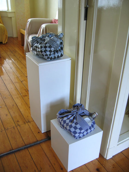 van de fles, de plooien en de knoop van de handdoek. Vervolgens